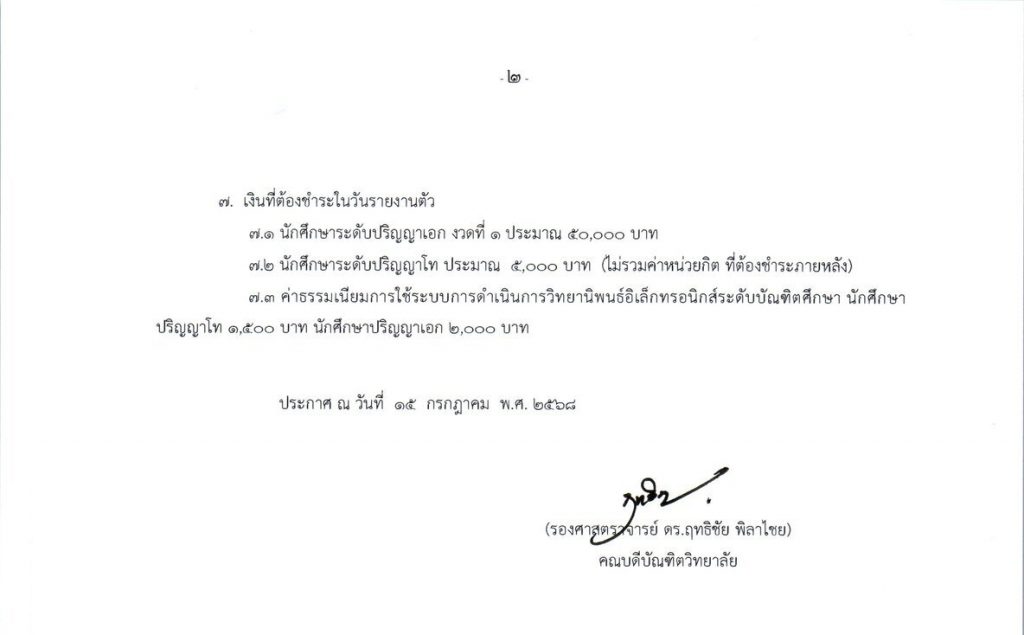 ๗.๒ นักศึกษาระดับปริญญาโท ประมาณ ๕,๐๐๐ บาท (ไม่รวมค่าหน่วยกิต ที่ต้องชำระภายหลัง) ๗.๓ ค่าธรรมเนียมการใช้ระบบการดำเนินการวิทยานิพนธ์อิเล็กทรอนิกส์ระดับบัณฑิตศึกษา นักศึกษาปริญญาโท ๑,๕๐๐ บาท นักศึกษาปริญญาเอก ๒,๐๐๐ บาท
