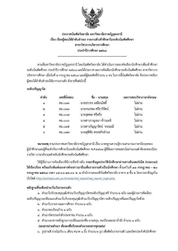 ให้ผู้ที่ผ่านการคัดเลือกที่มีรายชื่อข้างต้น กรอกข้อมูลประวัตินักศึกษาผ่านทางอินเตอร์เน็ต (Internet) ให้เรียบร้อย พร้อมกับพิมพ์เอกสารดังกล่าวมายื่นเพื่อรายงานตัวเป็นนักศึกษา ตั้งแต่วันที่ ๑๖ กรกฎาคม – ๒๐ กรกฎาคม ๒๕๖๘ เวลา ๐๙.๐๐-๑๖.๐๐ น. ณ สำนักงานคณบดีบัณฑิตวิทยาลัย อาคาร ๕ ชั้น ๒ โดยกรอกข้อมูลในเว็บไซต์ https://portal4.udru.ac.th/std_report/reg_report_login.php