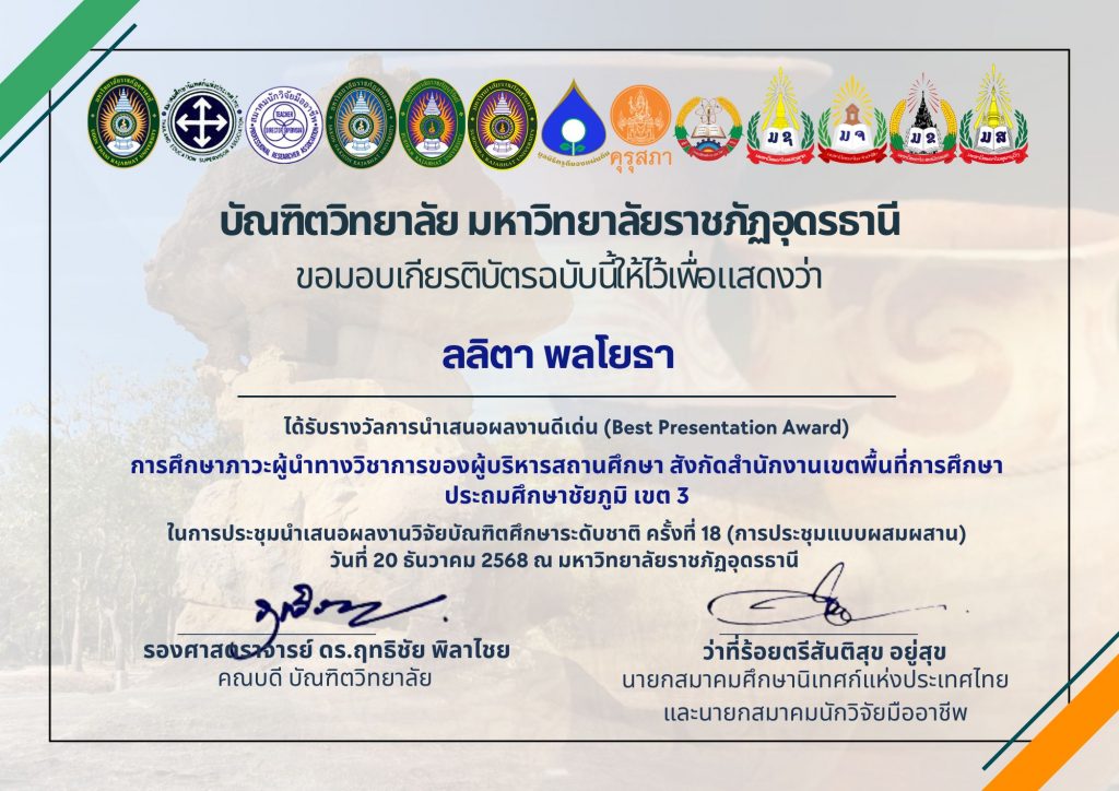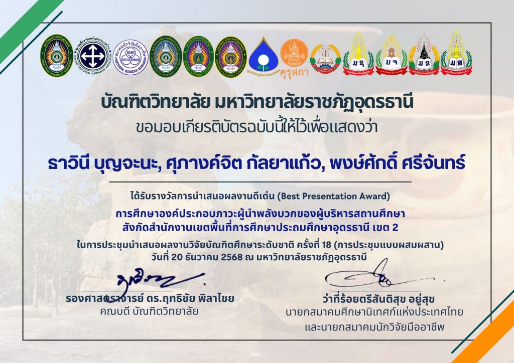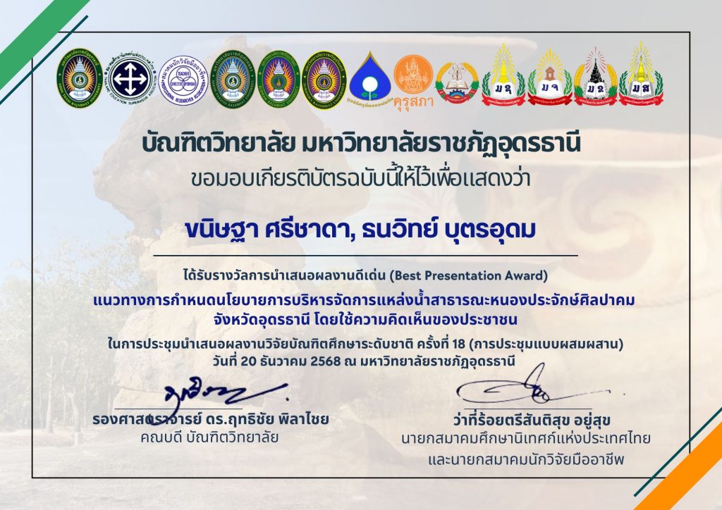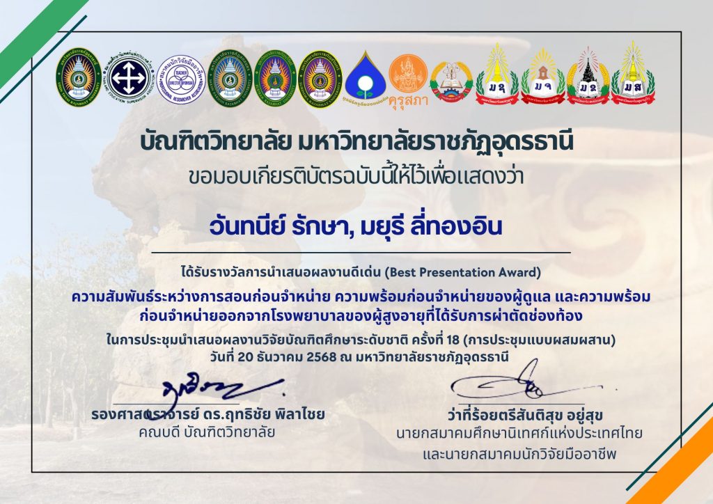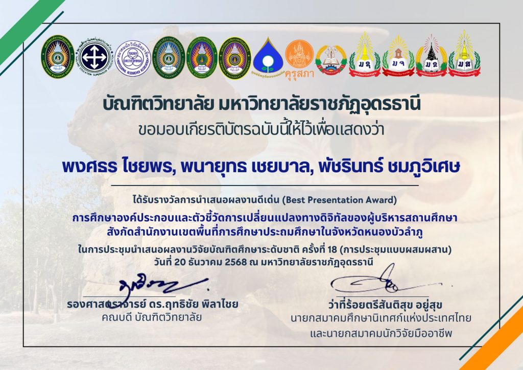 ประกาศผลการพิจารณารางวัลนำเสนอผลงานดีเด่น (Best Presentation Award) ในการประชุมนำเสนอผลงานวิจัยบัณฑิตศึกษาระดับชาติ ครั้งที่ 18 (การประชุมแบบผสมผสาน)
