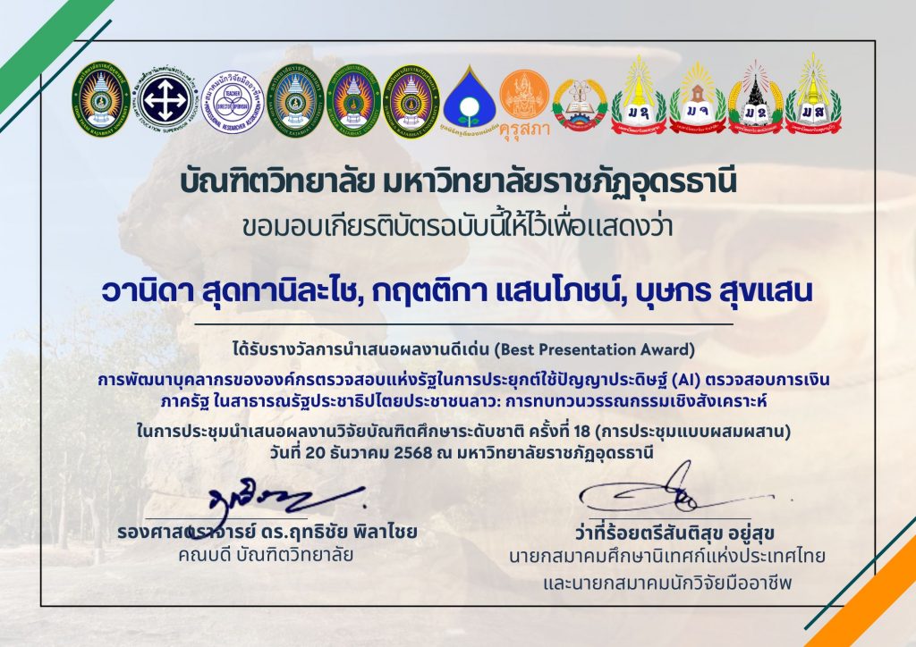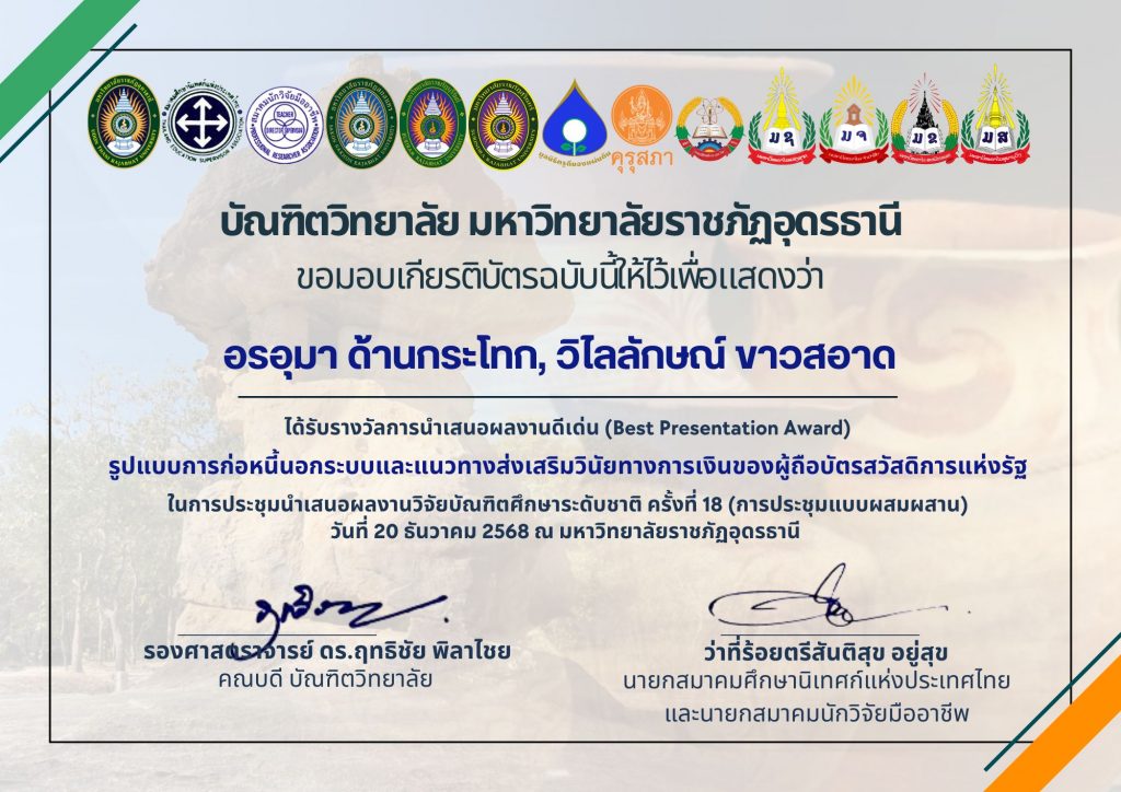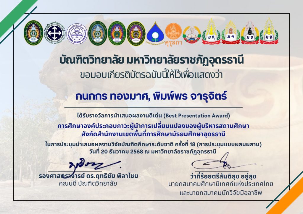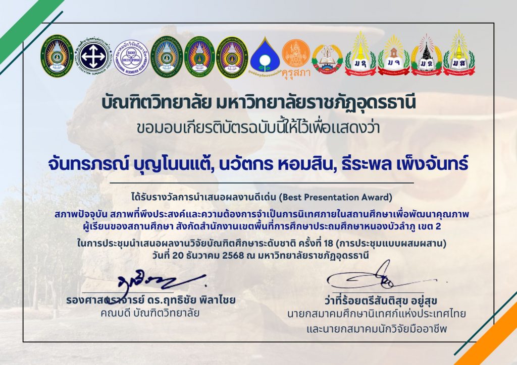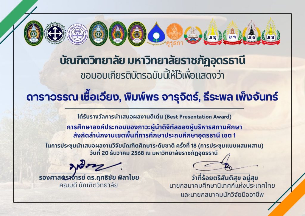 ประกาศผลการพิจารณารางวัลนำเสนอผลงานดีเด่น (Best Presentation Award) ในการประชุมนำเสนอผลงานวิจัยบัณฑิตศึกษาระดับชาติ ครั้งที่ 18 (การประชุมแบบผสมผสาน)