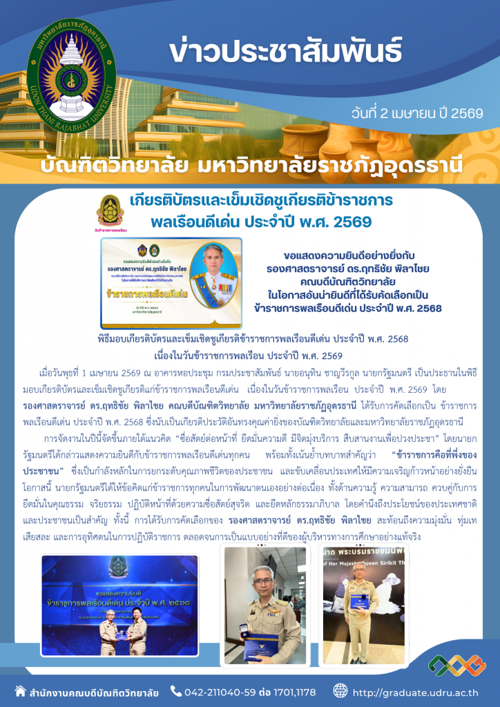 ขอแสดงความยินดียิ่งกับ รศ.ดร.น.สพ.ฤทธิชัย พิลาไชย คณบดีบัณฑิตวิทยาลัย ในโอกาสได้รับคัดเลือกเป็น ข้าราชการพลเรือนดีเด่น ประจำปี พ.ศ. 2568